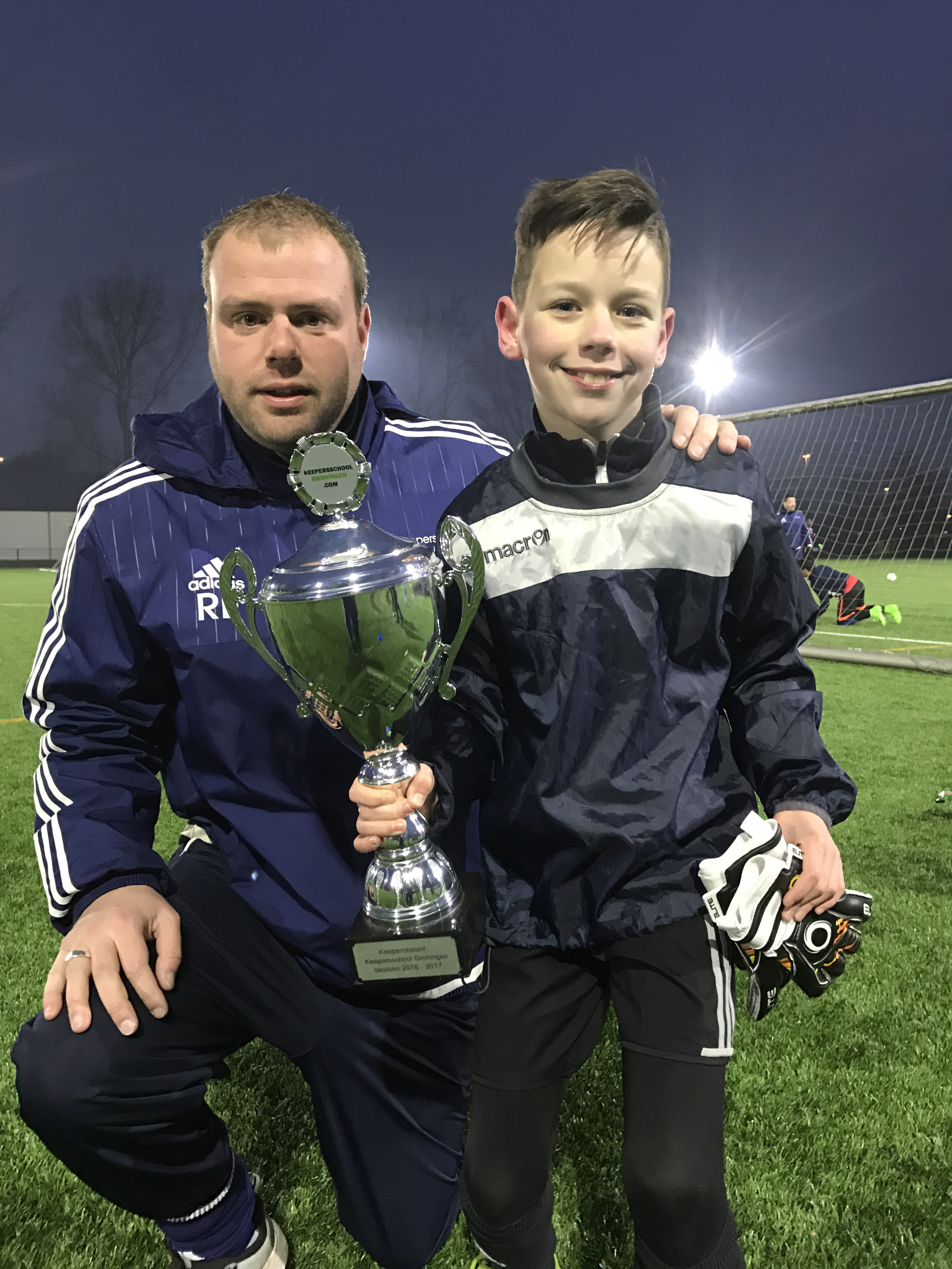Bij de Onder12-Onder 19 keepers was het Bas Runhart die de beker onder zijn armen mee naar huis nam. Bas is keeper van GVAV Onder 15-1. Dat Bas beter wil worden is wel duidelijk, sinds de start van onze trainingen in 2014 is hij wekelijks op het veld te vinden, ergens tussen de palen. Zo hebben we hem zien groeien van een rustige E keeper naar inmiddels een C keeper met bravoure. Bij Cambuur kennen ze Bas inmiddels ook, zijn stage is net verlengd. Ook dat is een mooie beloning voor de onverzettelijkheid van Bas en zijn missie. Beter worden! Wie weet, wordt zijn FC Groningen shirt omgeruild voor een shirt van Cambuur.