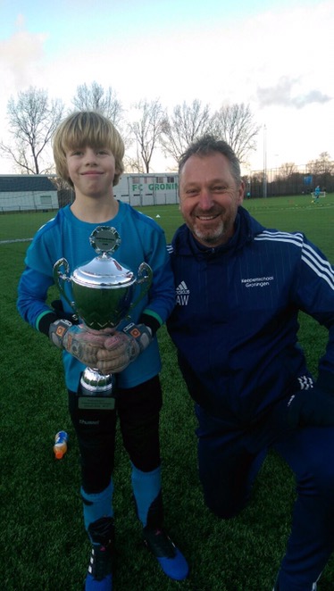 De wisselbekers stonden alweer klaar, meegebracht door de vorige twee winnaars. Bij de eerste trainingsgroep was het Finn van Dijk, keeper van GVAV Rapiditas JO11-1 uit Groningen die de beker met zijn herkenbare lach in ontvangst nam van traine Andre. Finn wil graag een betere keeper te worden en doet alles met plezier. Daarnaast helpt hij ook de andere keepers met goede opmerkingen over wat er nog beter zou kunnen zodat je nog eerder bij de bal bent of hoe je nog beter de bal kunt vasthouden.