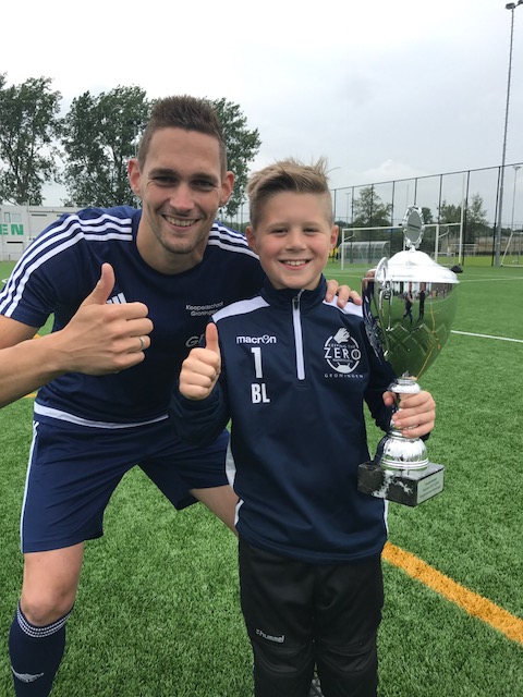 Bij groep 2 is het ook altijd dringen wie de felbegeerde beker mee naar huis mag nemen. De beker is voor veel keepers ook een mooi middel om hun spaarport te vullen. Opa’s, oma’s, vrienden, familie en de buurt hebben er altijd wel een euro voor over als beloning. Das mooi meegenomen. Vic Boersma, keeper van Velocitas 1897 is een van de keepers die er bij de allereerste training van Keeping the Zero bij was in september 2014. Het is dan ook wel duidelijk waarom de in juli 12 jaar wordende Vic wekelijks op de groene grasmat is te vinden. Doelbewust gaat Vic zijn gang. Waarom train je bij ons Vic, vroegen we hem. “Duh, om beter te worden natuurlijk” En dat is de spijker op zijn kop. Toen Vic binnenkwam in 2014 speelde hij nog in Velocitas F2 en was nog niet zo lang keeper. Inmiddels heeft Vic zich zo goed ontwikkeld dat hij komend seizoen de groenwitte kleuren van Velocitas mag verdedigen in de D1 (tegenwoordeig O13-1). Als het even niet gaat zoals we willen herpakt Vic zich razendsnel, en dat is waar het om draait. Zorgen dat je het maximale uit jezelf haalt tijdens iedere training en wedstrijd. De wisselbeker ging meer dan terecht naar Vic.