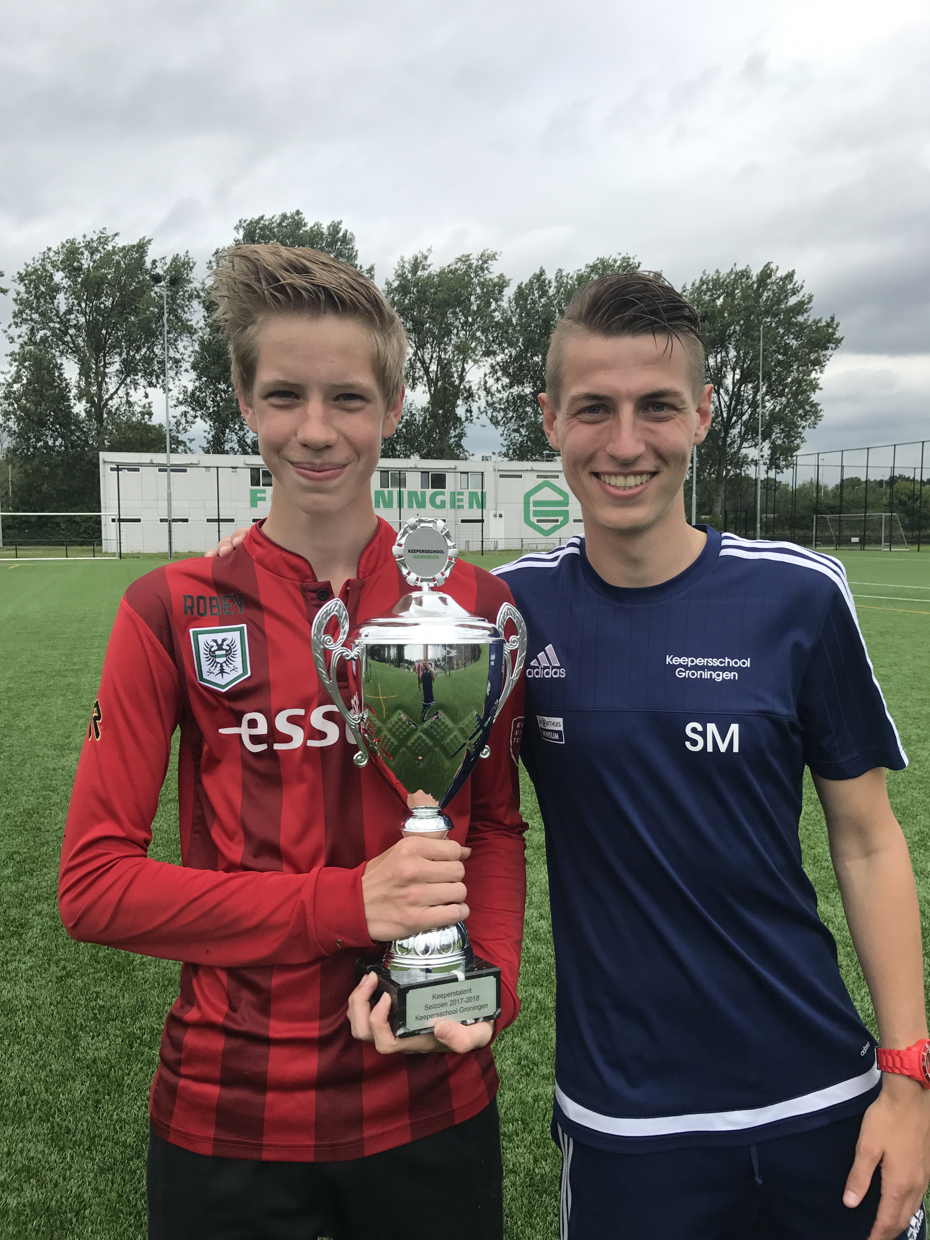 De in Zuidhorn woonachtige Jorik is sinds augustus 2016 wekelijks te vinden op de groene grasmat op Corpus om zich te ontwikkelen. Eerst op de vrijdagavond, sinds een aantal weken op de zondagochtend omdat we ook die mogelijkheid sinds kort hebben. Jorik speelde als tweede jaars C junior wekelijks zijn wedstrijden bij “zijn” club Zuidhorn in de C2 (Onder 15-2). Week na week deed Jorik zijn stinkende best om stappen te maken, want hij wilde het maximale uit zichzelf halen. Aangemoedigd door de trainers maakt hij grote stappen. Begin dit jaar maakten we samen de balans op. Jorik was wel toe een een stap hogerop. Zo gezegd zo gedaan, na een aantal Proeftrainingen besloot hij zich aan te melden bij GVAV vanaf komend seizoen. Inmiddels heeft hij daar de strijd gewonnen en speelt hij in de B1 (onder 17 – 1, uitkomend in de 3e divisie). Een prachtig voorbeeld dat je zelf eigenaar bent van je ontwikkeling. Van Zuidhorn C2 naar GVAV B1. De beker ging vandaag dan ook meer dan terecht naar Jorik.