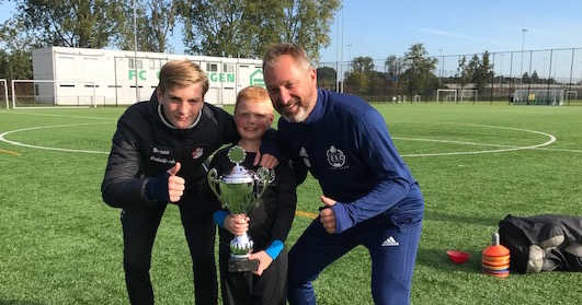 Tijdens de zondag training van 30 september was het dan ook weer genieten, zowel langs de lijn als op het veld. De zon scheen weer eens uitbundig. Bij de keepers die om 9 uur trainen was het de bij FVV uit Foxhol keepende Thijmen Nieborg die de beker in ontvangst kon nemen. De 7 jarige Thijmen is geboren op de laatste dag van 2010, dat maakt het extra lastig voor een keeper omdat hij voorlopig tegen grotere en oudere jongens zal voetballen. Toch zien we dat hij voor de duvel niet bang is en steeds beter de ballen die op hem afkomen onschadelijk weet te maken. Sinds februari zien we hem wekelijks op het veld, en dan is het mooi om te zien en te horen dat hij baalt als hij onverhoopt een keer niet kan trainen door omstandigheden.