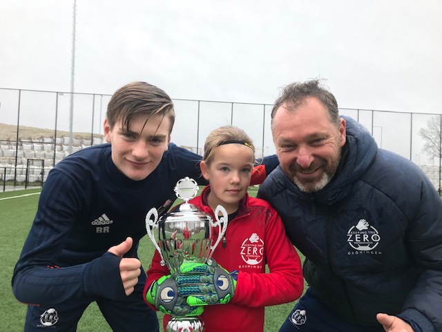 Bij de eerste keepersgroepen van zondag 2 december was het alweer een meid die de beker in ontvangst kon nemen. Deze zondag was het Leonie Terpstra die de beker mee naar huis kon nemen. Leonie (geboren in 2008) speelt haar wedstrijden voor FC Grootegast. We zagen haar voor het eerst als leergierige keeper tijdens een proeftraining in april van dit jaar. Ze besloot samen met haar ouders dat het te leuk was, en dat ze veel kon leren. Sinds die tijd zien we haar iedere week op het veld. Steeds beter kan ze situaties inschatten, is ze niet bang voor de bal en pakt ze ballen steeds beter vast. Iedere week weer en klein stapje vooruit maken is wat we graag zien. Leonie laat zien dat je dat kunt als je gewoon je best doet.