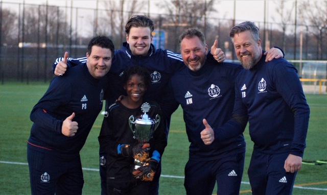 Tijdens de eerste trainingsgroepen was het na overleg met de trainers Lissandro Kalfsbeek die de beker in ontvangst kon nemen. Lissandro speelt zijn wedstrijden voor Veendam 1894. Het mooie aan de trainingen is dat je na een cyclus weer een andere trainer krijgt. De ontwikkeling die Lissandro daardoor heeft doorgemaakt is niet alleen mooi, het maakt ook gelijk duidelijk hoe e ontwikkeling van een keeper gaat. Sinds juli van 2018 traint hij wekelijks bij ons in Groningen. We moesten samen aan de bak, hij wilde beter worden en er was genoeg werk aan de winkel. Ballen loslaten, met de voeten ballen tegenhouden, op de knieën vallen, zomaar een paar dingen die in het systeem zaten van Lissandro. Inmiddels pakt de in 2007 geboren Lissandro bijna alle ballen vast, kiest hij steeds beter positie, gaat hij als een kat op de ballen af en keept zo sober dat keepen steeds eenvoudiger wordt. De beker ging dan ook mee naar huis in Veendam.