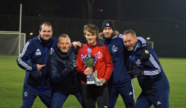 Bij de tweede keepersgroepen viel de regen onverminderd hard uit de lucht. Ook bij de oudere keepers was het genieten op het veld. Kjell Mul, spelend bij Helpman uit Groningen, pakte de bokaal voor zijn inzet en ontwikkeling. Deze jonge doelman heeft een tomeloze inzet. Daarmee laat hij zien dat je alles kunt leren als je dat zelf maar wilt. En daarnaast zelf de punten weet waar je aan moet werken om beter te worden. De in 2002 geboren Kjell staat sinds oktober 2015 iedere vrijdag samen met ons op het veld. Samen doen we er alles aan om weer een nieuwe stap in zijn ontwikkeling te zetten. Soms dagen we de keepers uit, en soms kijken hoe ze reageren als we de omgeving aanpassen. Tenslotte komt de drive om beter te worden uit jezelf. Juist daar valt Kjell op. Continue bezig om beter te worden. De keepers nemen even rust, de vrijdag trainingen worden weer hervat op vrijdag 31 januari 2020.