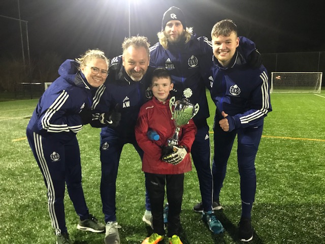 Bij de eerste trainingsgroepen van 17 uur ging de wisselbokaal naar de in 2010 geboren Dean Bos. Dean speelt zijn wedstrijden voor DVC Appingedam. We zagen hem voor het eerst tijdens een van onze keepersdagen in februari 2019. Man wat had hij een plezier. Hij wilde wel beter worden, maar hoe doe je dat dan precies. Dus besloot hij samen met zijn ouders dat hij iedere week de rit naar Groningen wilde maken om zich te kunnen ontwikkelen. Na de zomervakantie van 2019 was het dan ook zover. Sindsdien zien we hem iedere week en is hij steevast als eerste aanwezig. De ontwikkeling die hij doormaakt is dan ook noemenswaardig, stapje voor stapje heeft hij door wat hij moet doen in welke situatie. Niet bang zijn, enkels strak houden, handen zacht maken en zo is er nog veel meer. Dean snapt het steeds beter. De beker ging dan ook met een grote glimlach mee naar Appingedam,