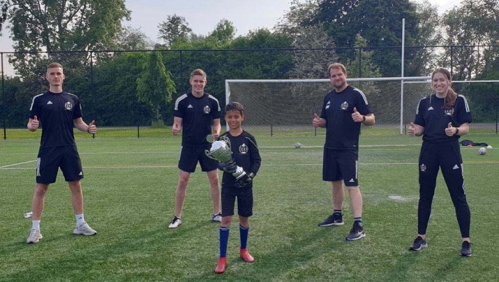 Op de training van vrijdag 4 juni ging de bij GVAV spelende Tim van Meel met de beker naar huis in Groningen. Tim, geboren in december 2010, zien we al ruim anderhalf jaar op onze trainingen. Dat hij in december is geboren zet hem op achterstand, zo speelt hij meestal tegen kinderen die 6 tot 11 maanden ouder zijn. In de concurrentie is dat ook het geval. Dat moet hij het hebben van zijn drive, passie en inzet. Dat groeien komt vanzelf. Gewoon goed eten en slapen. En juist in die passie vinden we elkaar. Tim is altijd met een lach op het veld, en als het moet gebeuren in de oefenvormen is hij bloedserieus. Dat maakt het ook zo leuk om met hem te werken. Plezier als basis. Dan komt de ontwikkeling vanzelf.