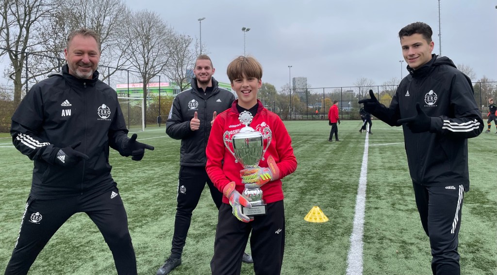De 2e beker ging naar de in Wildervank wonende Kevin Norder. Hij is geboren in 2007. Sinds dit seizoen speelt hij bij FC Emmen. De jaren daarvoor bij Wildervank. We hebben hem nu een aantal jaren in onze keepersopleiding in Groningen, en dan ontstaat er iets. Zijn ontwikkeling werd niet altijd gezien door iedereen, wij zagen zijn potentie en zijn met hem gaan werken. Met de overstap naar FC Emmen afgelopen zomer als gevolg. Echter, dan begint de volgende stap. Hoe kan ik mij verder ontwikkelen. Want bij een betaald voetbalclub zitten is mooi, maar dat is niet alles. Je moet er veel voor doen en veel voor laten. Dat beseft Kevin ook. We zien enorm uit zijn verdere stappen te mogen begeleiden.