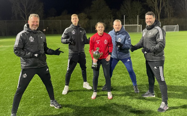 De tweede beker van vrijdag 11 februari werd bij de volgende trainingsgroepen gretig binnen gehengeld door de in 2008 geboren Luna Spin. Dit is er ook weer eentje hoor. Wat een gretigheid. Toen Luna 4 jaar geleden voorzichtig de eerste stappen met ons op het veld zette was ze nog wat beduusd. Van alle keepers om haar heen. De ballen vlogen nog om haar oren. We zijn samen gaan werken aan haar ontwikkeling. En ja, dat bloeit iets moois. Toen, in 2018, speelde ze nog bij ZVC, want ze woont in Gieterveen. Inmiddels speelt ze bij Veendam 1894 op hoog nivo. En ze zit bij de KNVB selectie. Bij de beste keepers van Noord en Oost Nederland. Samen met Megan Brugge, die ook bij ons op het veld rondloopt. Luna is rustig maar enorm gretig. Haar talent is groot, haar drive nog groter. En dat is cruciaal. Ze ziet zichzelf ooit graag in Oranje. Daar is ze een mooi eind mee op weg.