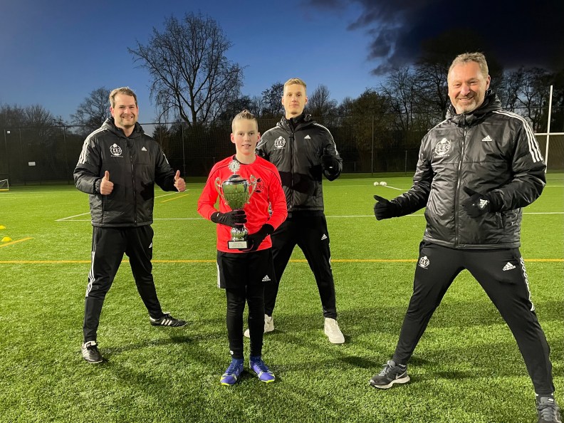 Bij de trainingen van vrijdag 11 februari was het weer genieten langs de lijn en op het veld. De keepers werden met passie weer gepusht om het maximale uit zichzelf te halen. We nemen geen genoegen met ballen tegenhouden. Alles moet vast. Bij de eerste trainingsgroepen was het de in 2010 geboren Nick Koning die de beker als beloning voor zijn ontwikkeling mee naar huis kon nemen. Nick speelt bij GVAV Rapiditas in Groningen. We zien hem al bijna 3 jaar iedere vrijdag op het veld. Hij is dan ook een echte liefhebber. En dat zijn alle keepers die bij ons trainen. Wat een motivatie heeft Nick. Het is heerlijk om samen met hem op het veld te staan. Hij moppert nooit maar doet wat er gevraagd wordt. Hij begrijpt dat hij hard moet werken om nog beter te kunnen worden dan hij al is. Zijn ontwikkeling is dan ook mooi voor ons om te zien. De tips die hij krijgt pakt hij ook daadwerkelijk op.