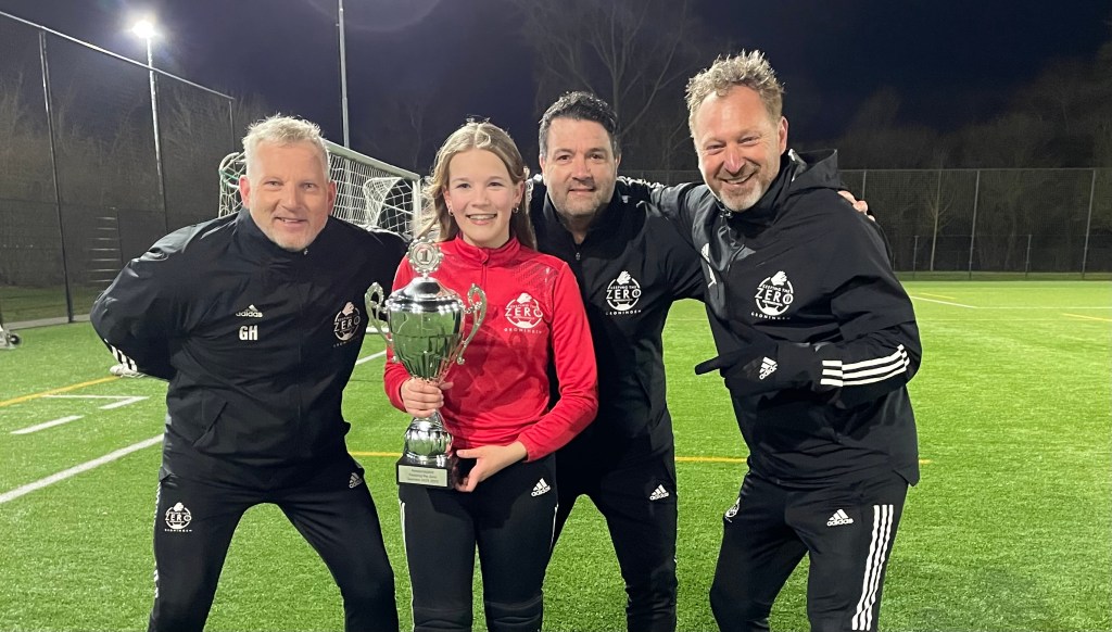 Bij de tweede trainingsgroepen was het de in 2008 geboren Leonie Terpstra (Grootegast) die de beker mee naar huis kon nemen. Inmiddels zien we haar al 4 jaar iedere zondag op het veld in Groningen op sportpark Corpus den Hoorn. En dat gaat met verve. Ze past zich aan en trekt zich op aan het nivo. En we zien haar genieten. In alle rust werken we samen aan het proces van beter worden. En als ze dan merkt dat ze ineens die bal pakt die ze eerst niet kon pakken, dan gelooft ze in zichzelf. Want zo werkt het. Geloof in jezelf. Dan straal je het uit en pak je meer ballen. Goed en hard trainen is vereiste. We zijn enorm trots op Leonie!