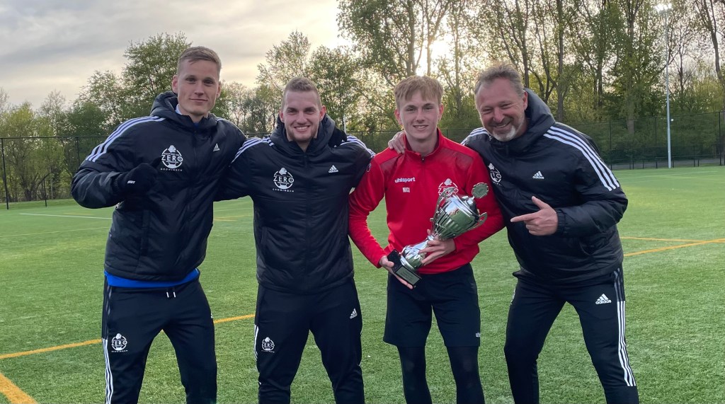 De tweede beker van vrijdag 29 april ging naar de in 2005 geboren Nick Potze. Nick speelt bij Nieuw Buinen. Deze in Musselkanaal geboren Nick zien we echt al jaren. De training was dan ook om te smullen. Niet alleen met Nick maar met de hele groep. Er werd hard en fanatiek getraind. Dat zien we graag, gekoppeld aan humor. De kreten vlogen dan ook door de lucht; “wat een redding, fantastische bal, pak nou eens wat, rust bewaren, de baas zijn in de situatie” en dat soort dingen. Langs de lijn was het dan ook een heerlijk schouwspel. Nick heeft enorm veel talent, dat omzetten op het veld is nog niet altijd even makkelijk. Maar het gaat hem steeds beter af.
