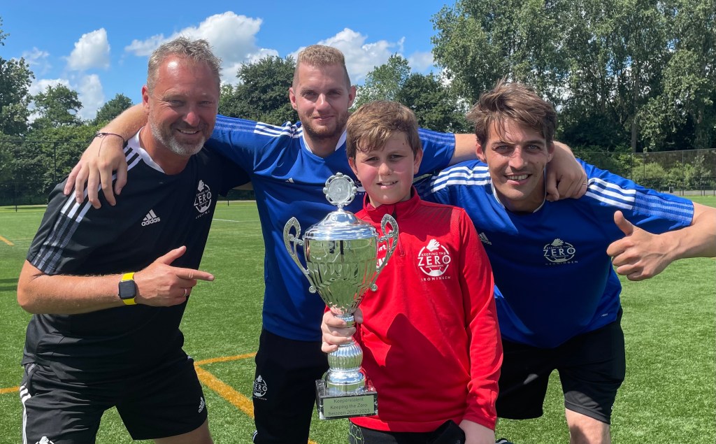 De laatste beker ging naar de in 2009 geboren Orfeas Illianidis. Wat een prachtige naam. Als keeper doe je altijd je best. Dat geldt ook voor Orfeas. Met een lach staat hij altijd op het veld. Hij geniet van de aandacht die hij krijgt, en voelt zich bovendien als een vis in het water tussen alle andere keepers. Want dat is het mooiste. Bij je club ben je de enige keeper. Bij de trainingen van Keeping the Zero zijn we allemaal keepers. Dan ontstaat er saamhorigheid. Orfeas speelt bij GVAV.