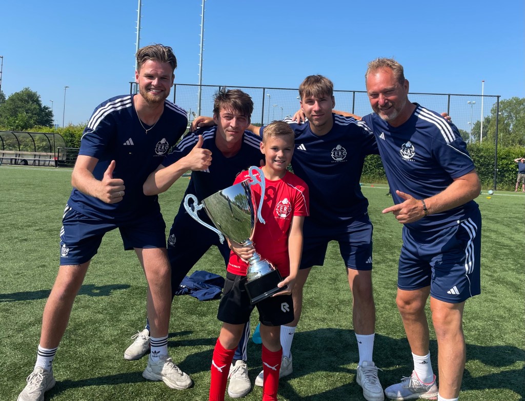 Op zondag 25 juni waren de bekers er natuurlijk ook. De in 2014 geboren Jayden Huising kon hem amper tillen, maar nam hem toch graag mee naar huis. Jayden kan er wat van hoor. Wonend en voetballend in Wildervank zien we hem iedere week op het veld. Toen hij bij ons kwam in juni 2022 had hij maar 1 doel. Zich verder ontwikkelen. We zijn inmiddels een jaar verder. De progressie die hij heeft gemaakt is dan ook enorm. Hoe dat komt? Gewoon omdat Jayden een liefhebber is. Graag ballen willen tegenhouden. Springen en duiken vindt hij pas echt tof.