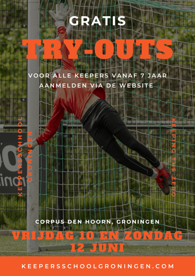 Keepersschool Groningen is de keepersopleiding van Groningen. Wekelijks leiden we 140 keepers op vanaf 7 jaar op vrijdag en zondag. Op vrijdag 10 juni en zondag 12 juni houden we gratis TRY OUTS. De TRY OUTS zijn op de volgende tijden: Vrijdag 10 juni 17.00 of 18.15 uurZondag 12 juni 10.00 of 11.00 uur Aanmelden … Lees verder Gratis TRY OUTS voor jeugdkeepers